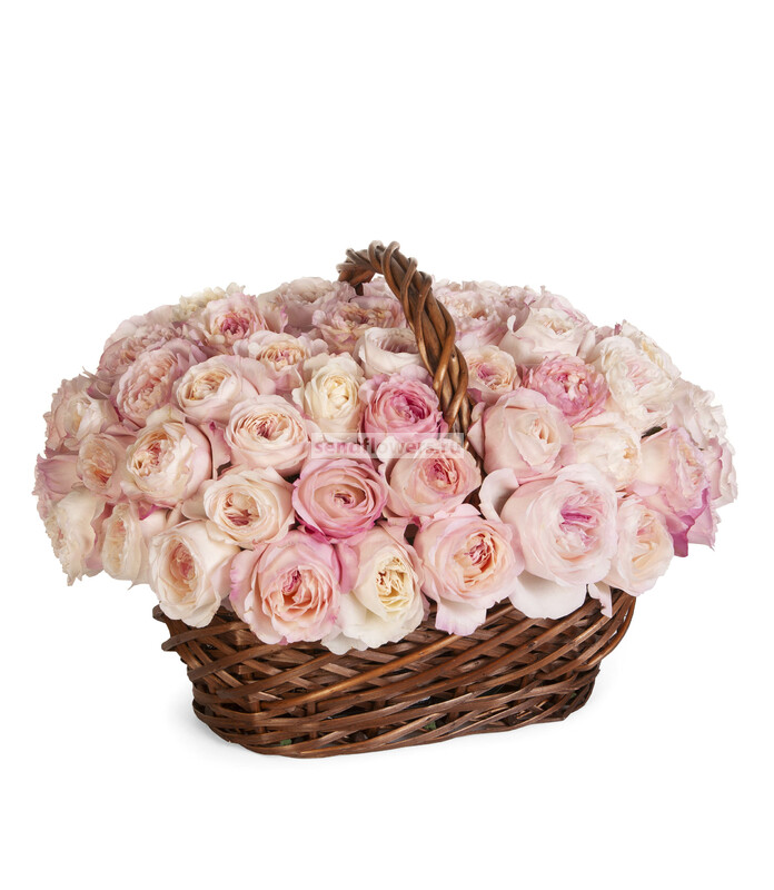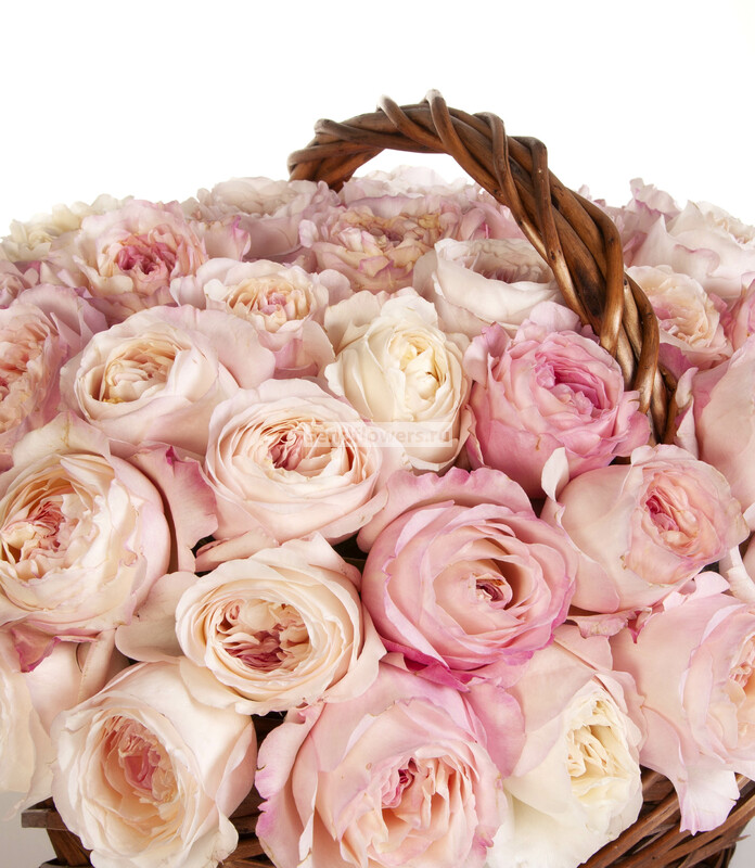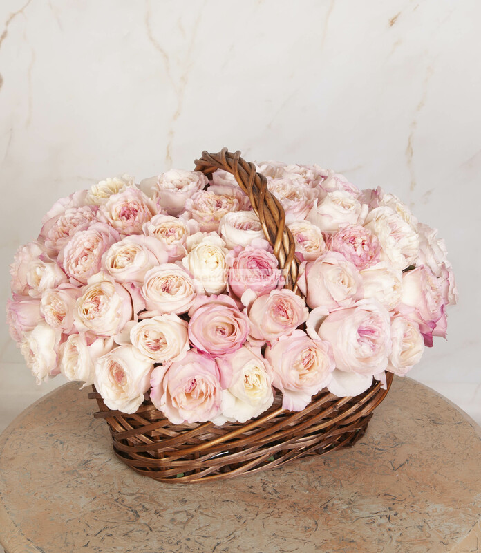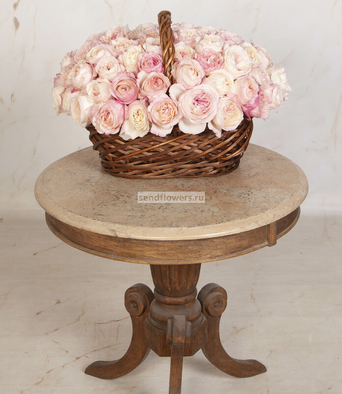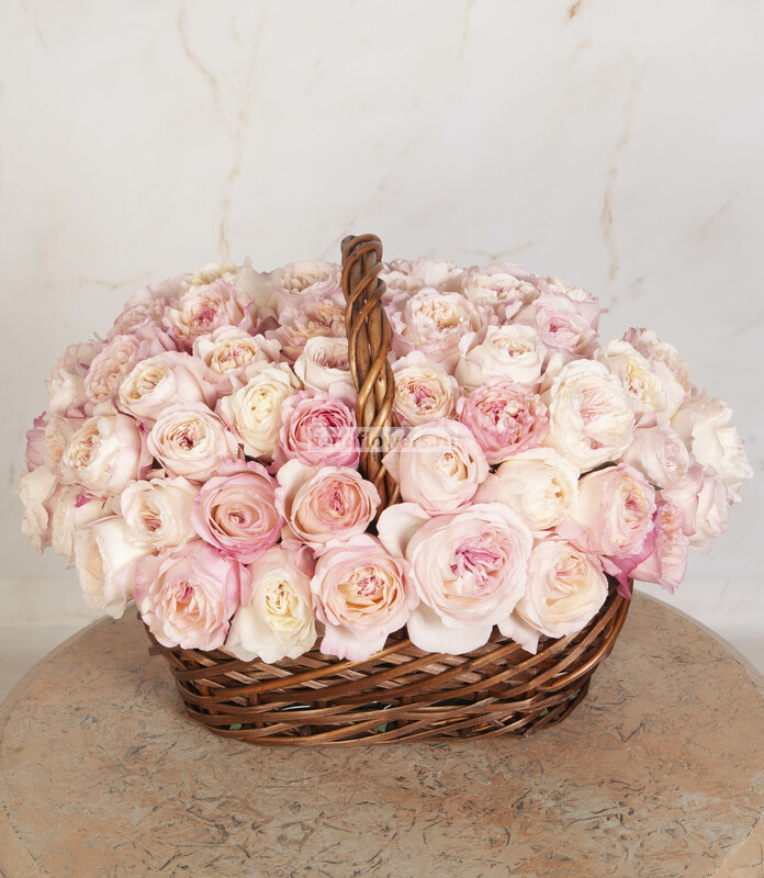 Состав: Корзина большая (1), Салал (30), Оазис кирпич (8), Роза David Austin Keira (розовая) (101)