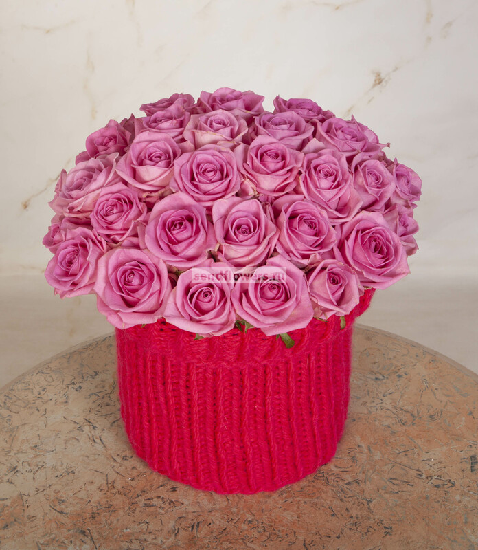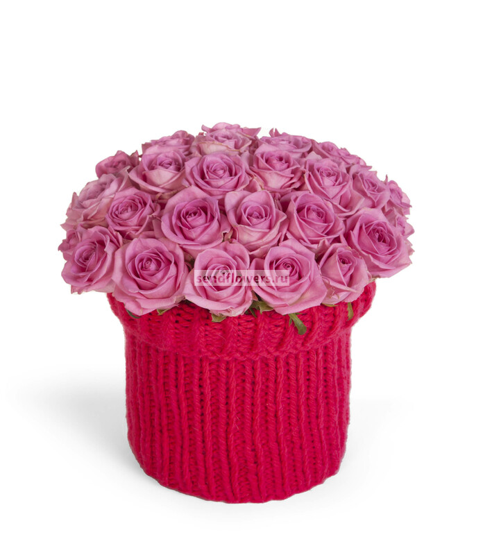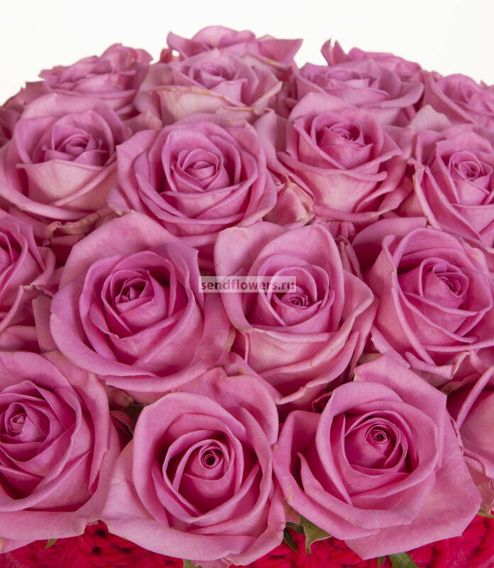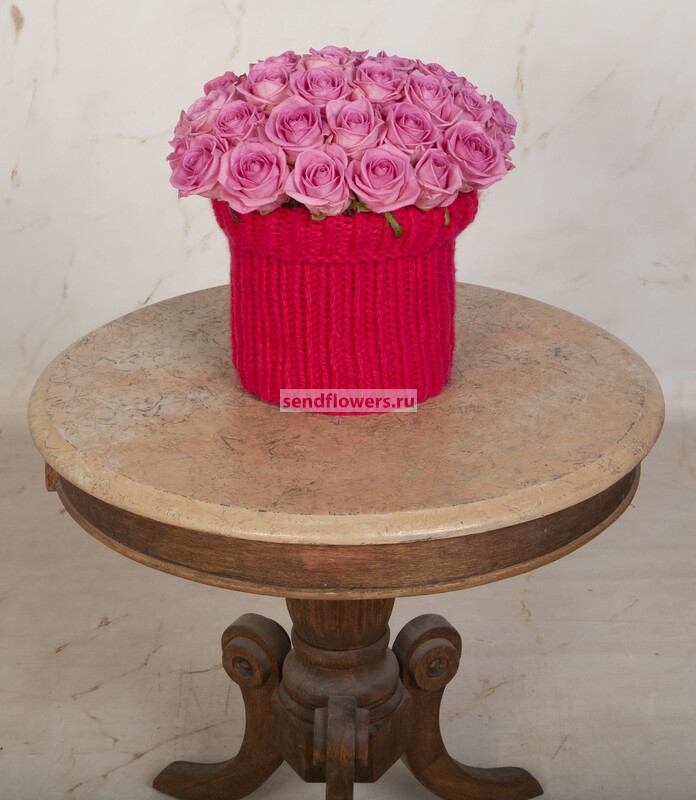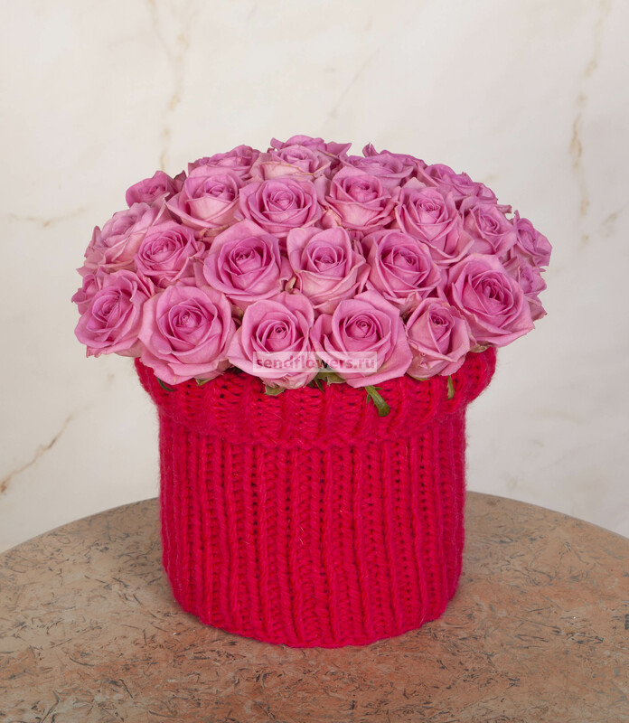Состав: Оазис кирпич (2), Роза розовая (51), Бархатная коробка черная (1), Вязаный чехол на коробку (красный) (1)
