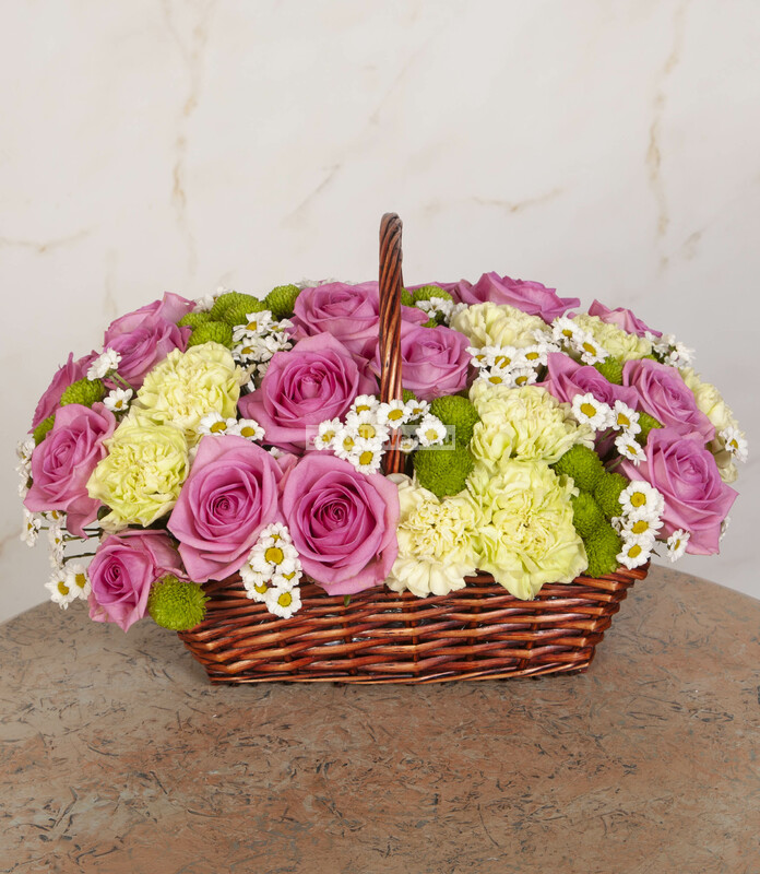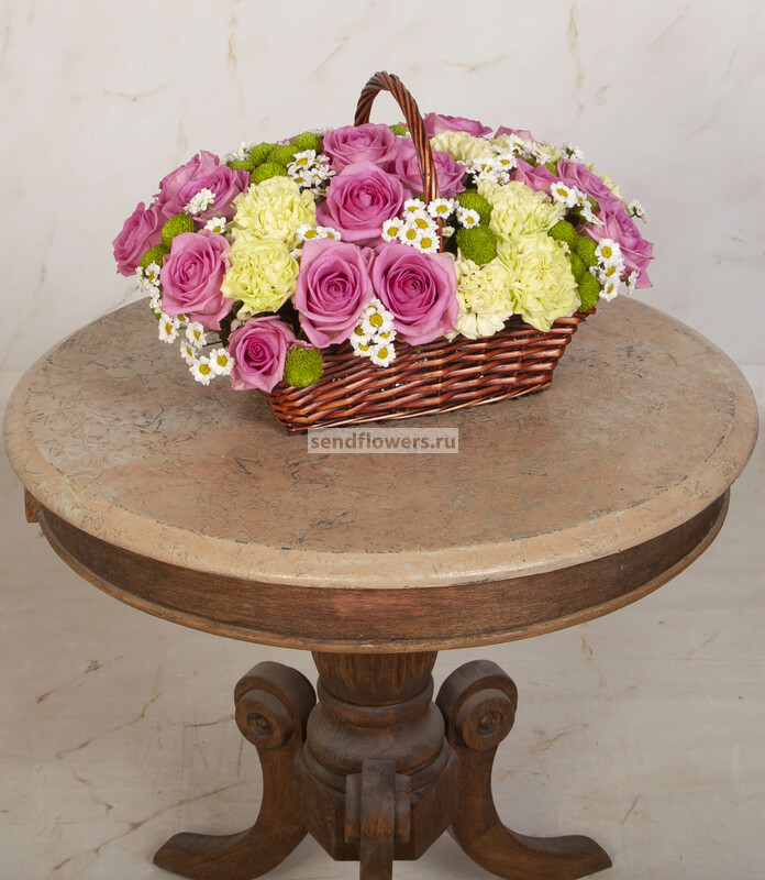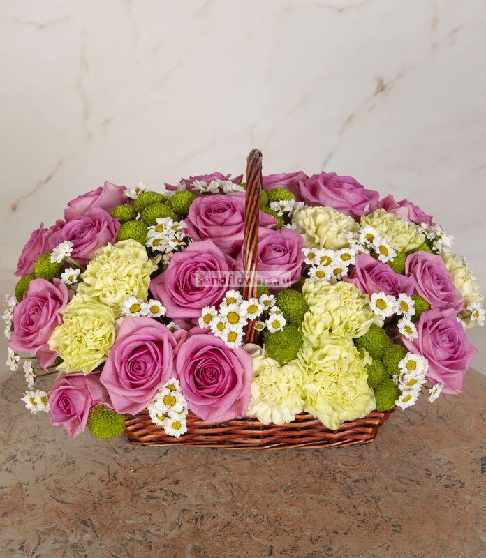 Состав: Корзина средняя (1), Оазис кирпич (4), Фисташка (7), Гвоздика зеленая (15), Роза розовая (25), Хризантема Сантини белая (6), Хризантема Сантини зеленая (15)