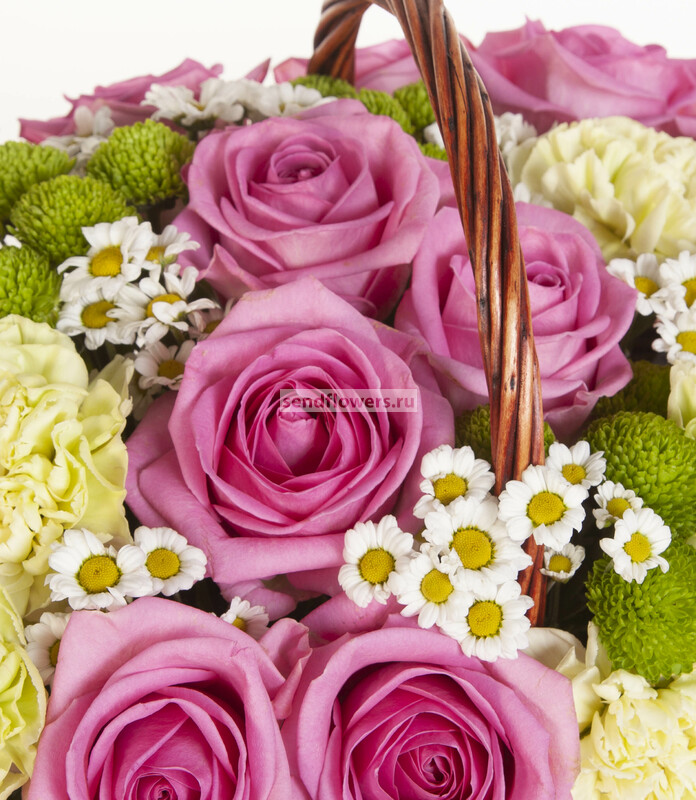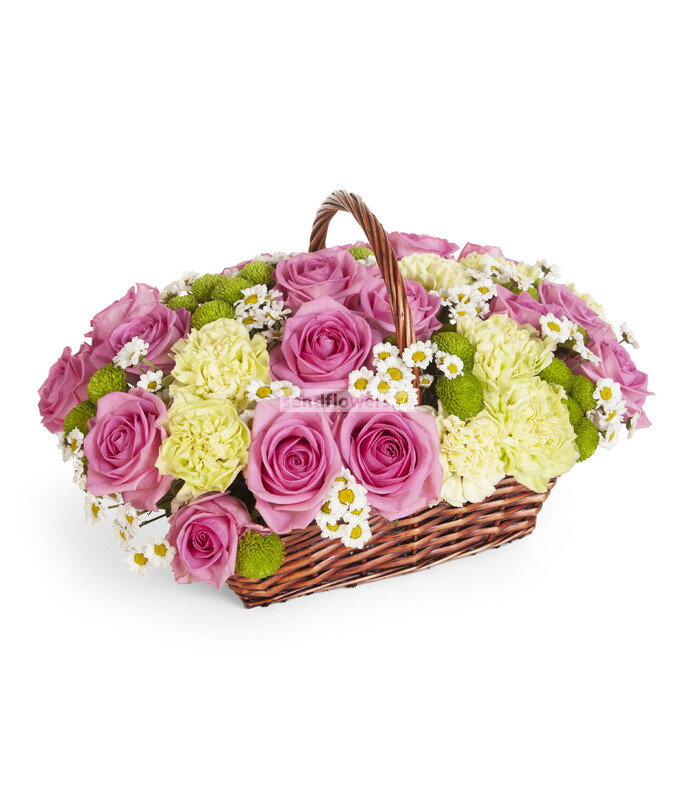 Состав: Корзина большая (1), Оазис кирпич (6), Фисташка (9), Гвоздика зеленая (20), Роза розовая (30), Хризантема Сантини белая (10), Хризантема Сантини зеленая (20)