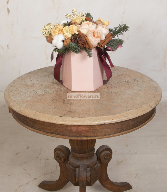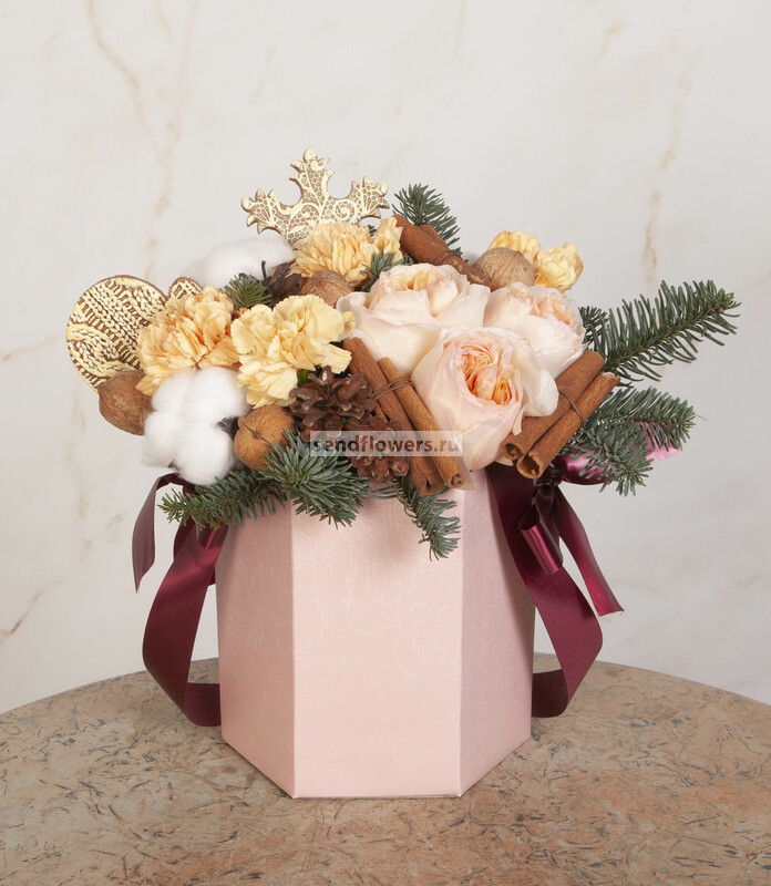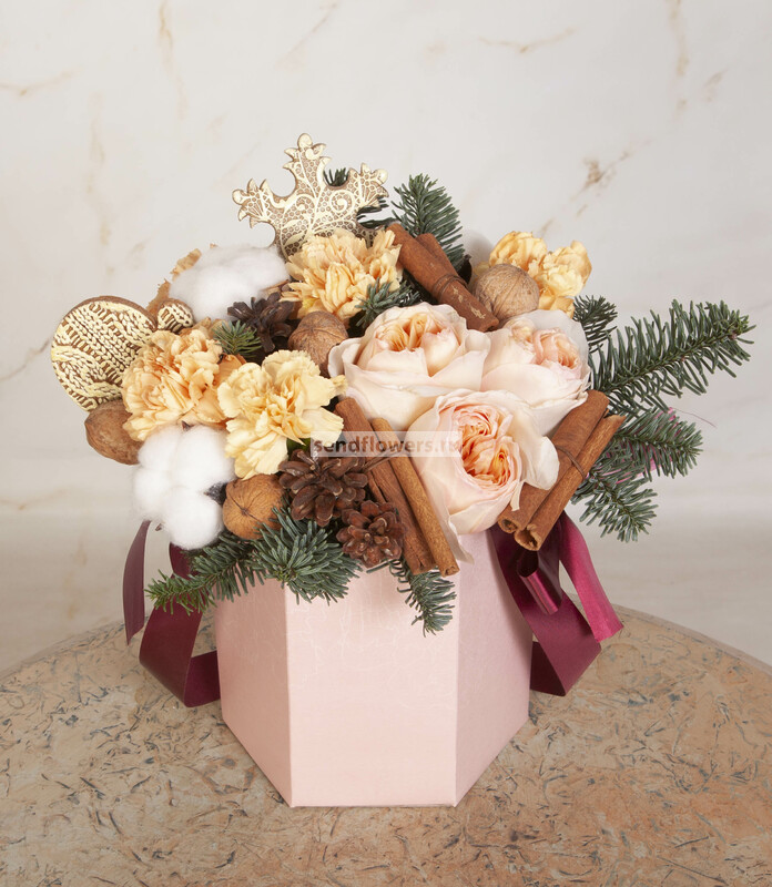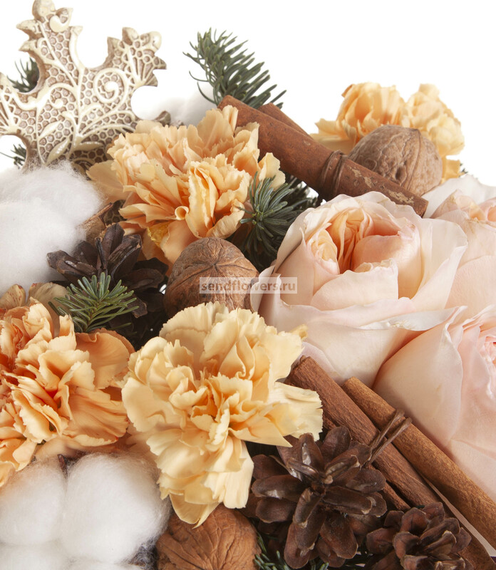 Состав: Оазис кирпич (2), Лапник (1), Хлопок (3), Шишка натуральная (5), Корица (6), Роза David Austin Juliet (персиковая) (3), Грецкий орех (7), Коробка-ваза (180х180) цв. розовый беж (М) (1), Гвоздика Crazy Horse (5), Авторская игрушка "Имбирный пряник" (2)